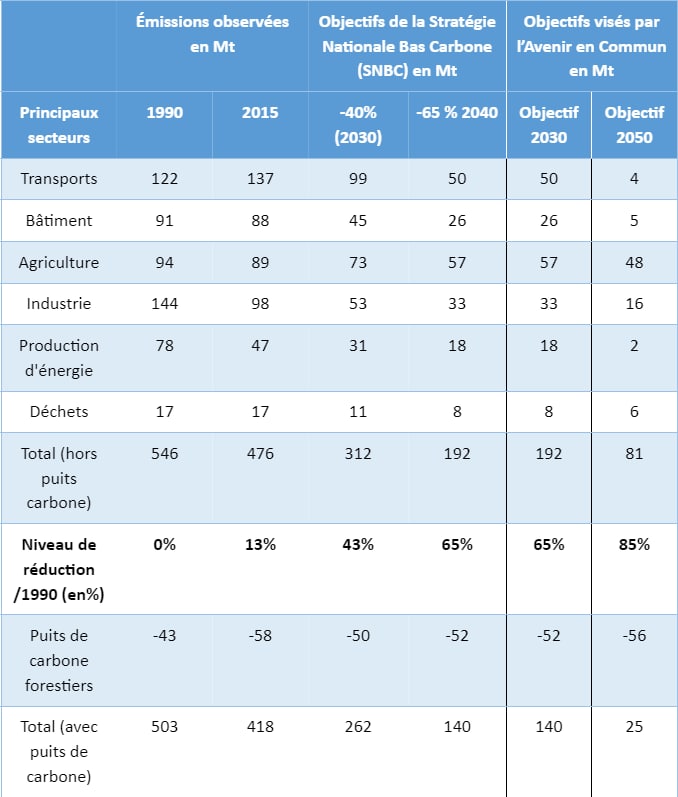 Le présent budget carbone s’appuie sur les projections d’évolution par secteur des émissions de la Stratégie nationale bas-carbone (SNBC). Celle-ci atteint l’objectif de réduction de 65% des émissions de GES en 2040. Les objectifs sectoriels que nous nous fixons pour 2030 correspondent donc au point de passage prévu par la SNBC en 2040. Nous avancerons ce point de passage dès 2030. Le tableau suivant récapitule les objectifs sectoriels de notre programme.